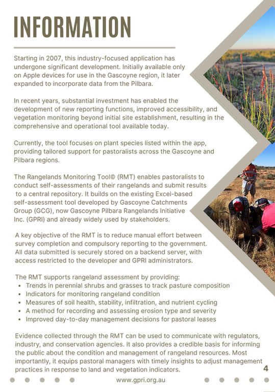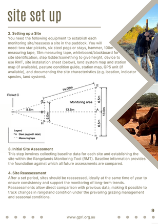 This booklet is designed to guide pastoralists through using the Rangelands Monitoring Tool in the field. It brings together practical tips, step by step instructions and simple explanations to help you establish a new site or re monitor an existing one with confidence.